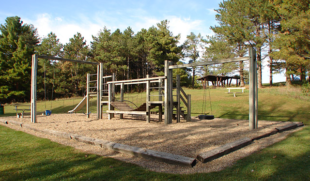 As you drive north into the park you can see Mariposa Recreation Area Lake on your left. Further into the park you will come upon a large gravel parking lot. To the west of the parking area is a picnic shelter, playground equipment, open grassy space and the lake. The park road continues on in a loop through a campground. The north part of the park has a dense stand of trees with a short hiking path.